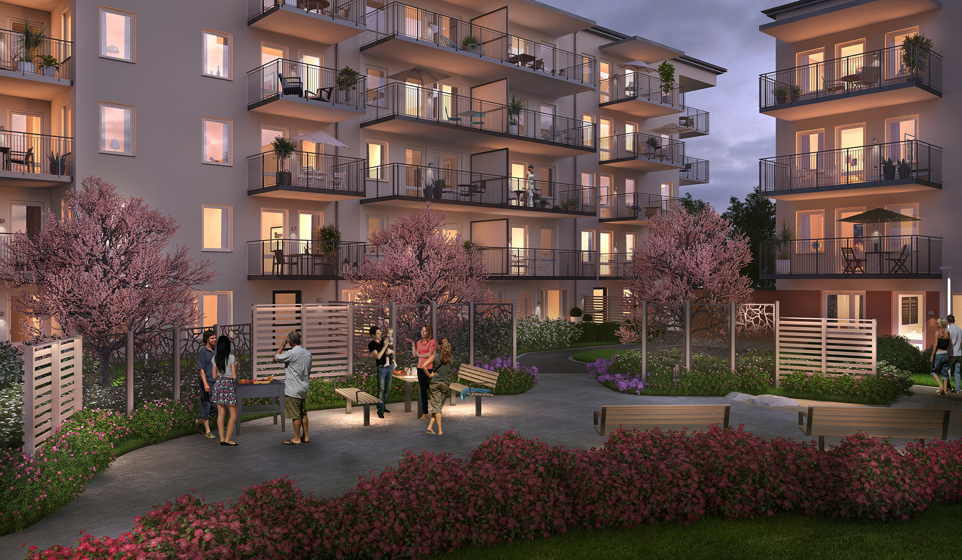 Utanför gårdens centrum skapas mosaik av mindre oaser. Rundade planteringsytor bäddar in de enskilda terrasserna medan träskärmar och spaljéer förstärker den privata sfären. Den dämpade och dynamiska belysningen gör gården överskådlig även under dygnets mörka timmar.